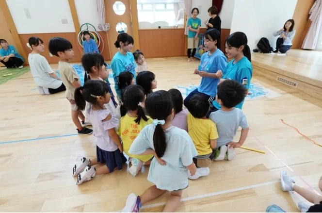 私たちが作詞・作曲し、振付も考えたダンス「おさかなパラダイス」と、日高管内の特産品であるししゃもとさけになりきって、最終的にはお寿司になるというサーキット形式の「おさかな体験レース」を行い、子どもたちと一緒に楽しく活動しました。