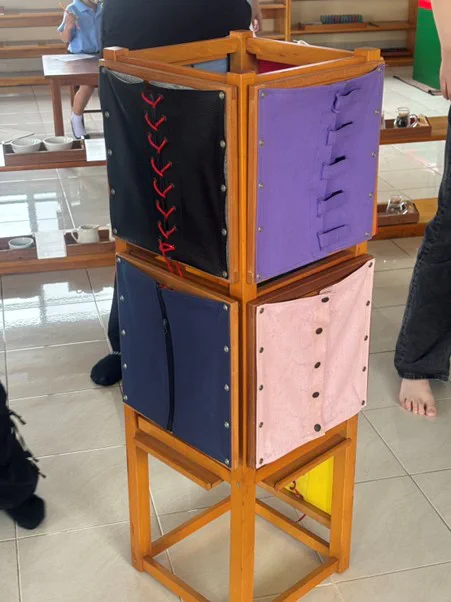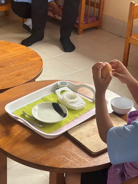 例えば、水を汲む道具、ベルトをつけたり紐を結ぶ壁、本物の卵やバナナを使ってカットしたり殻をむいたりするスペース、掃除道具、タオルを畳み重ねる棚などが教室内設置されていました。マッサージで有名なタイらしく、幼児用のマッサージスペースも用意されていました。